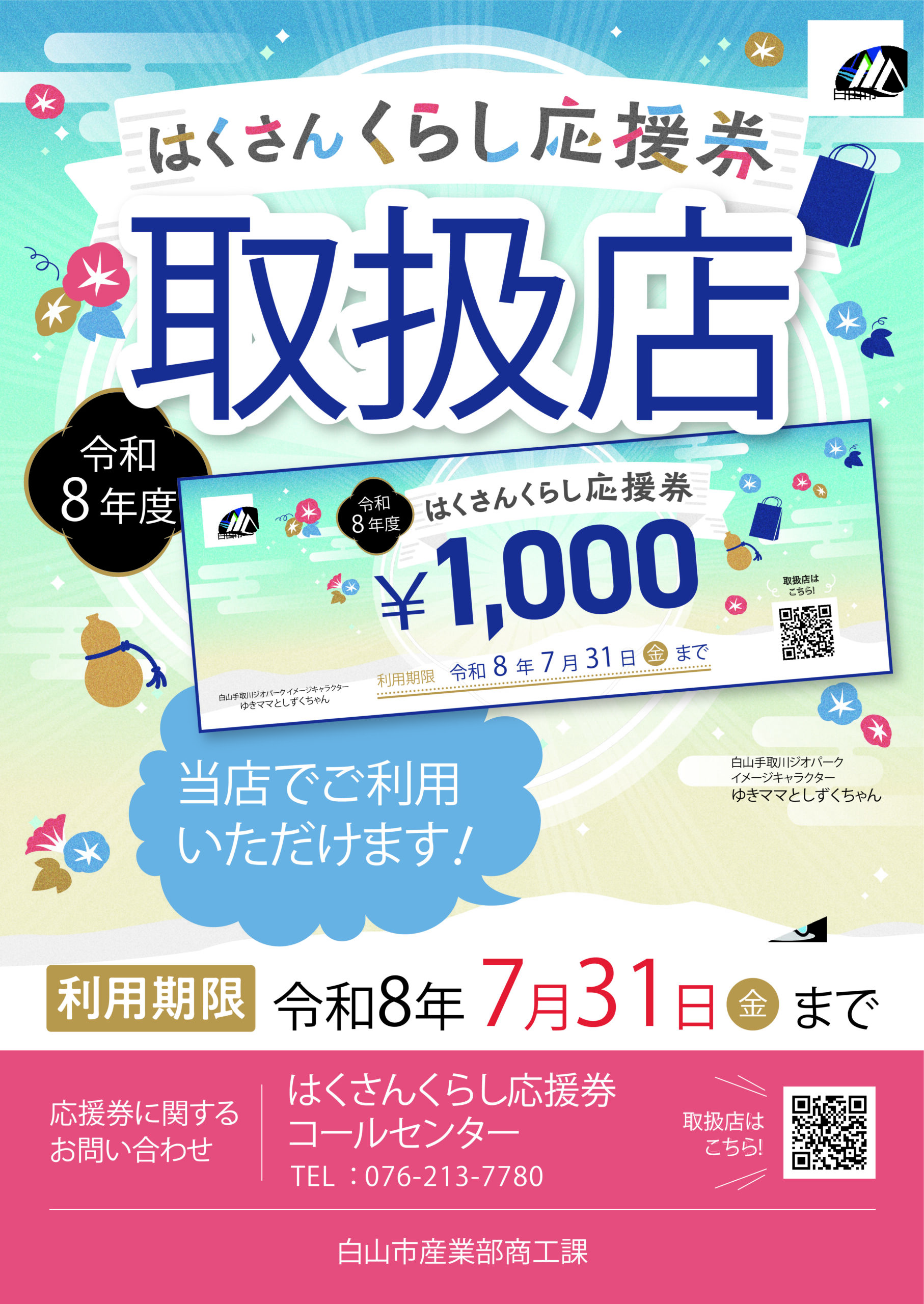 白山市より『はくさん くらし応援券』が4月末に発行されることとなり、白山市内の【取扱店登録事業所】にて7月31日までご利用いただけます。